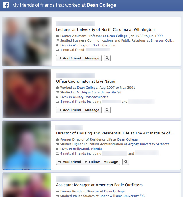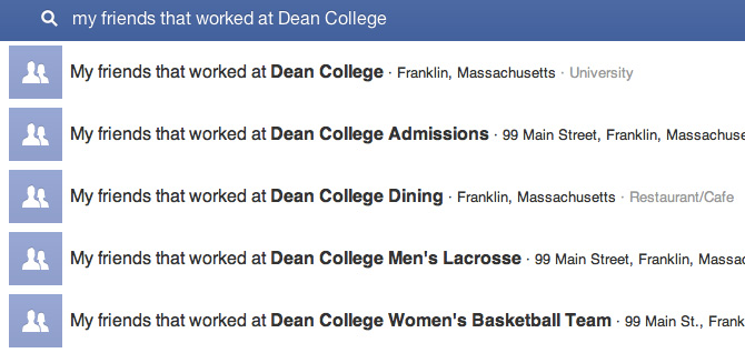 But then, I realized I could search for “friends OF FRIENDS that work/worked at Dean College.”  Blam!  There was a list of individuals including the mutual friends that connected us.