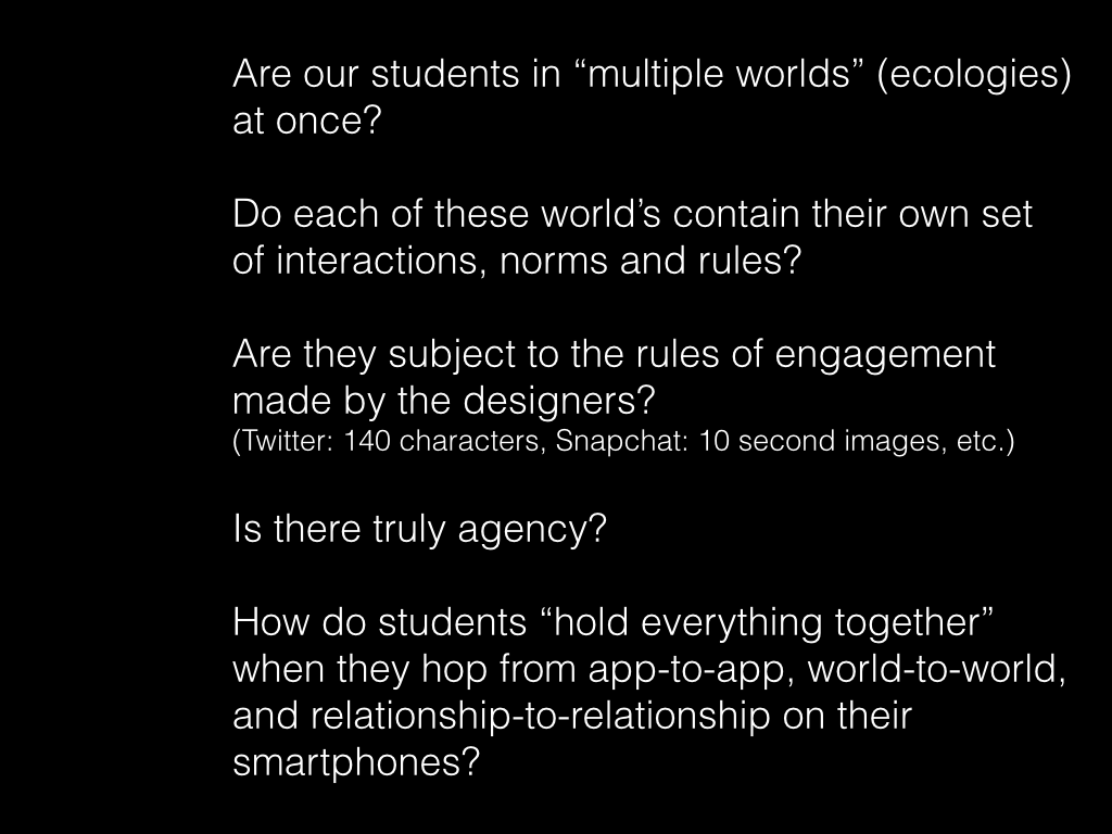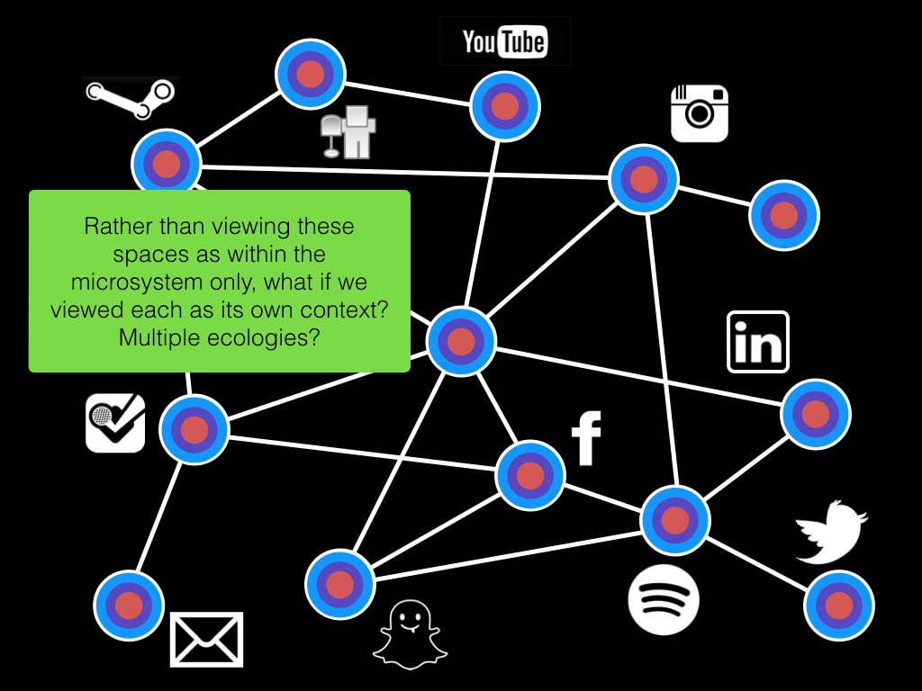 Placing student interactions with others on social media, which may not be considered truly “face-to-face,” in the micro/mesosystem layer makes sense. “Virtual worlds” act very much similarly as “real worlds.” BUT What if we think about these spaces differently? What if they are, in themselves, separate contexts? Maybe even separate ecologies? This bends (perhaps even violates) Bronfenbrenner’s theory a little bit, but at the very least I think it brings forward some interesting questions.