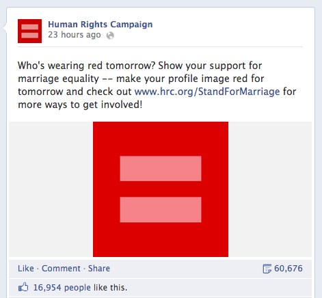 In March of 2013, another viral campaign occurred around support for marriage equality. On the eve of an important Supreme Court ruling on the matter, the Human Rights Campaign, an LGBT advocacy organization, posted to their Facebook account asking people to change their profile pictures to a red equals sign. The action took off and there are some interesting data analytics that explain more about that happened.