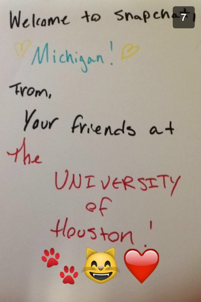 The University of Houston also gave a shout out to Michigan for joining them on Snapchat. Houston was one of the first universities in the country to initiate a presence on the app.