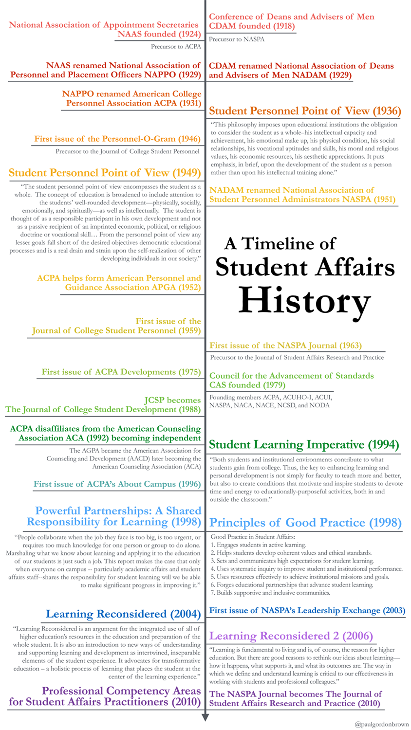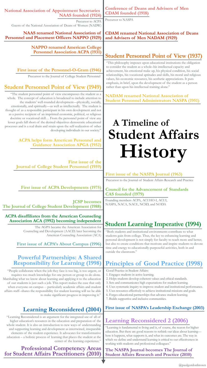 UPDATE: Great feedback from everyone on the timeline. I’m thinking of creating an “Equitable Timeline of Student Affairs History” as an additional post. Given the space constraints of the design, my original focused more squarely on publication and major ACPA/NASPA events. I struggled with how to present a more inclusive history here. If there are events that should be included in an equitable timeline, put them in the comments below and I’ll work something up!