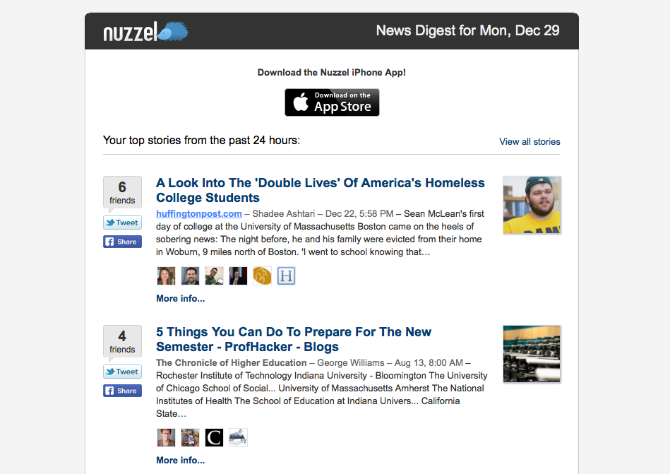 Nuzzel is an amazing little app/web service that helps surface the news your friends and others in your network care about. Log into Nuzzel and connect your Twitter and Facebook accounts. Then, daily, or at an interval of your choice, you will receive an email containing the most shared links of the day from those in your network. The results even appear rank-ordered with the number of times shared, thumbnails of the sharers, and their comments about the link. Nuzzel is a great way to make sure you don’t miss out on the news that your colleagues and friends care about. An example of my daily digest is below. Because I work in higher education, many of my friends do as well. Therefore, a lot of the links that surface in Nuzzel are typically of interest to me. Nuzzel also has an app if you’d prefer to access it that way. I’ve been using Nuzzel for a while now and I LOVE it.