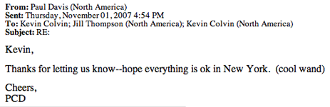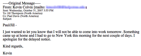 This is the story of Kevin Colvin, a bank intern. Kevin needed to “go out of town” suddenly and sent his boss the following email: