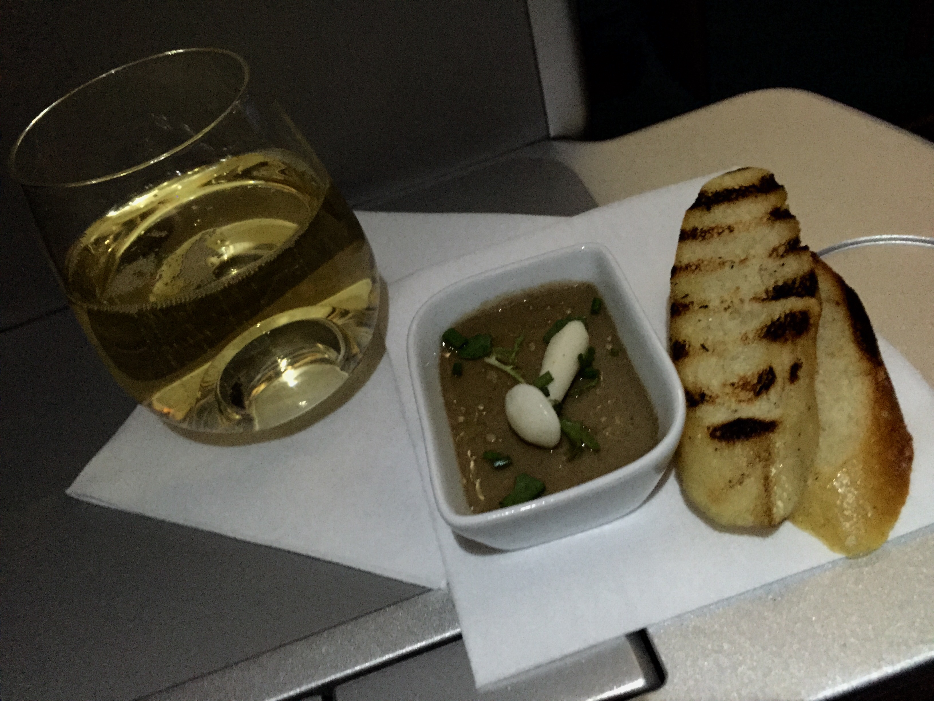 Sparkling wine always. 🙂 Oh, and the appetizer was portobello mushroom mousse… which made me want to close my suite door and quietly lick the bowl. Best thing I had on the whole flight.