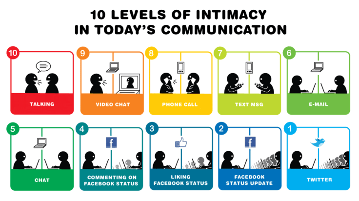 One of the important ancillary findings arising out of my research is the need to teach college students about choosing the best to communication method for the contexts they find themselves in and the goals they want to achieve. As the infographic above illustrates, different media have different levels of intimacy. They also allow for different ranges of expression. Talking face-to-face still holds the opportunity for the greatest range of expression– allowing for non-verbals such as body language, enunciation, tone, etc. Electronic text-based media are the most limited and are often subject to misinterpretation. Talking face-to-face, however, limits one’s audience. Social media can reach far larger audiences and audiences that are dispersed over a larger geographic area. Each communication method has its positives and negatives.