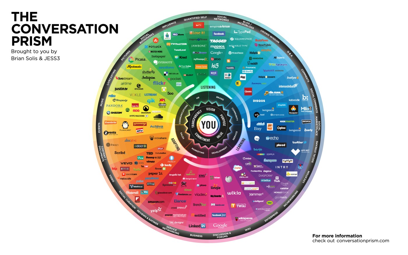 Developed in 2008 by Brian Solis, The Conversation Prism is a visual map of the social media landscape. It’s an ongoing study in digital ethnography that tracks dominant and promising social networks and organizes them by how they’re used in everyday life.