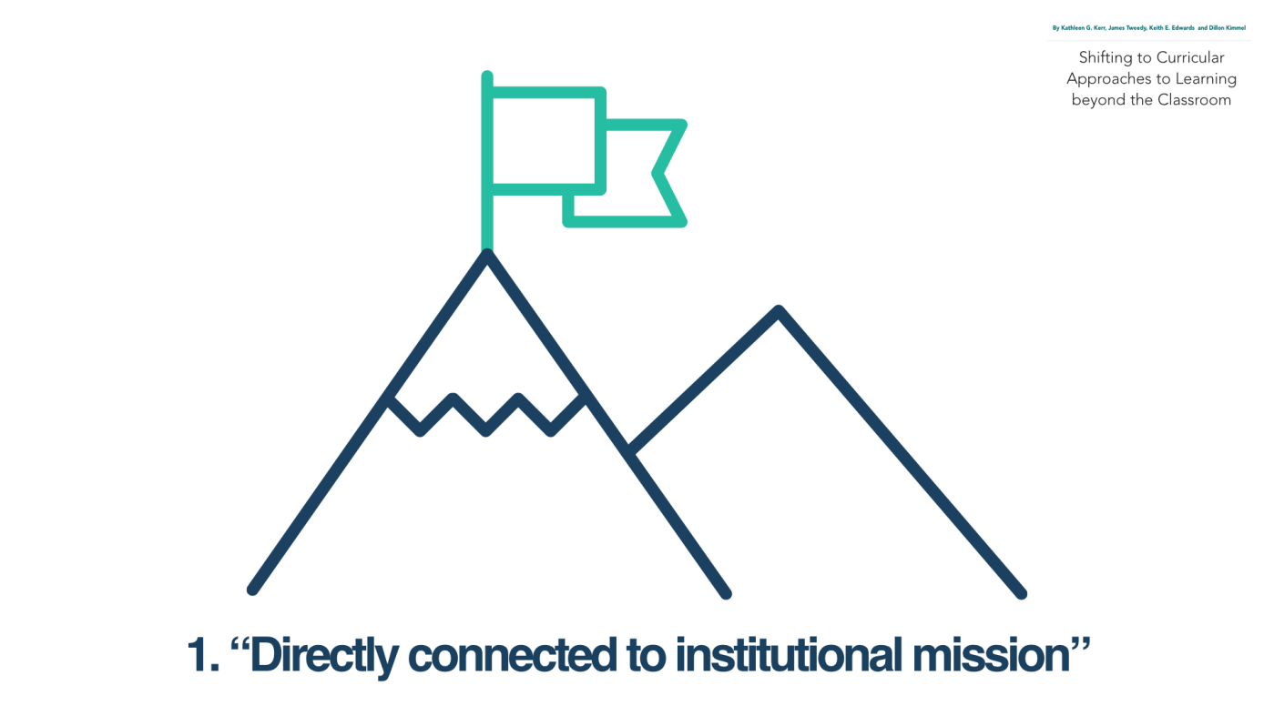 Reference: Kerr, K. G., Tweedy, J., Edwards, K. E., & Kimmel, D. (2017, March-April). Shifting to curricular approaches to learning beyond the classroom. About Campus, 22(1), 22-31. doi:10.1002/abc.21279