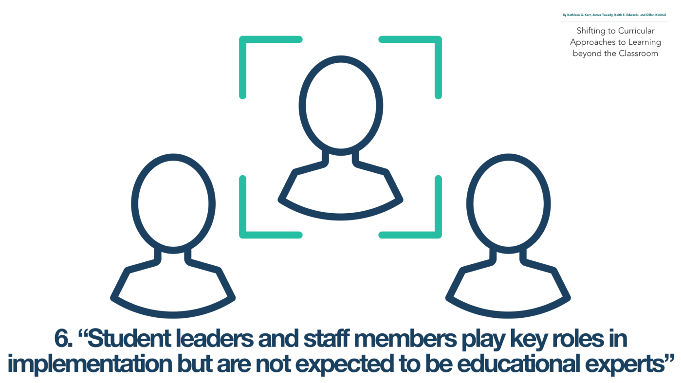Reference: Kerr, K. G., Tweedy, J., Edwards, K. E., & Kimmel, D. (2017, March-April). Shifting to curricular approaches to learning beyond the classroom. About Campus, 22(1), 22-31. doi:10.1002/abc.21279
