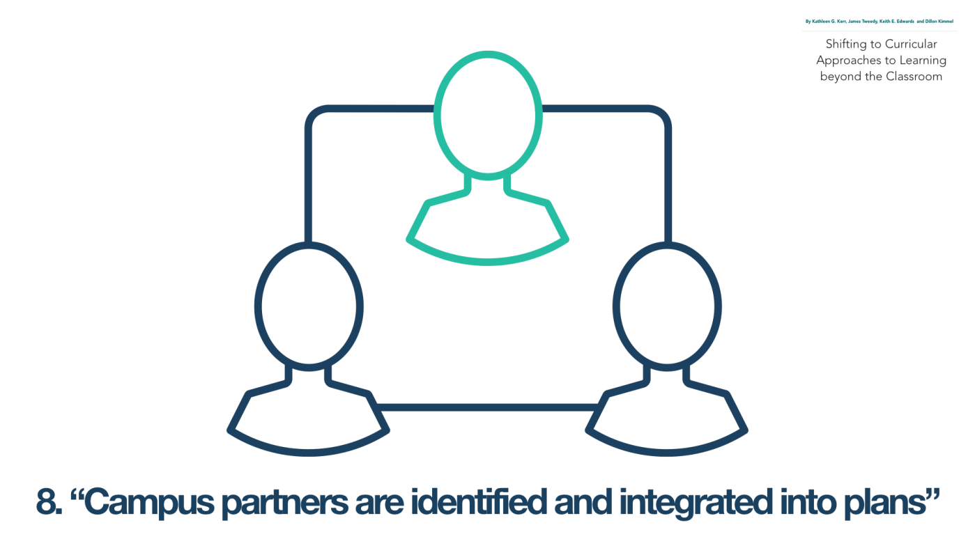 Reference: Kerr, K. G., Tweedy, J., Edwards, K. E., & Kimmel, D. (2017, March-April). Shifting to curricular approaches to learning beyond the classroom. About Campus, 22(1), 22-31. doi:10.1002/abc.21279