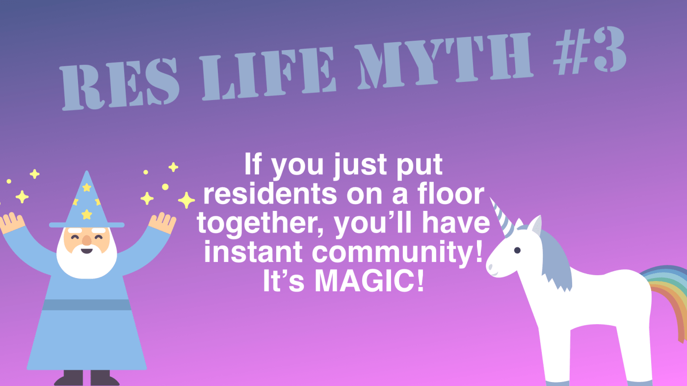 Believing that community building happens naturally and doesn’t require intervention is a myth. This “myth” is often not one that is widely believed by most professionals that work in residence life, but rather those that work outside of it. What many individuals do not realize is the amount of work and intentionality that goes into developing happy, healthy, and productive communities. Rather than just providing “sleeps and eats,” campus housing and residence life departments construct living spaces with intentionality. This intentionality has many benefits beyond just the “warm fuzzies” of community belonging. It can impact student retention, health, academic success, and many other issues.