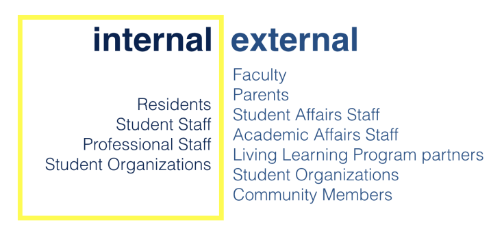 Partners and stakeholders can be both internal and external. Internal partners and stakeholders are those within your own department. For example, in residence life, they can include your resident assistants, professional staff, residents, and student leadership organizations (such as your hall governments or Residence Hall Association). External partners can include on-campus constituencies (such as student affairs departments or faculty), or off-campus constituencies (such as parents or community members).