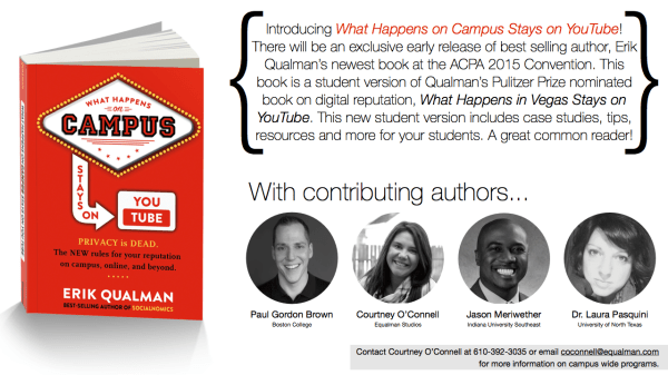 Today is the day! The "What Happens On Campus Stays on YouTube," the book to which I am a contributing author, is available for shipping! A great work geared towards college students that helps them understand their digital identity and the potentials and pitfalls of interacting online. You can order yours on Amazon now! Want a peek inside... Continue Reading →