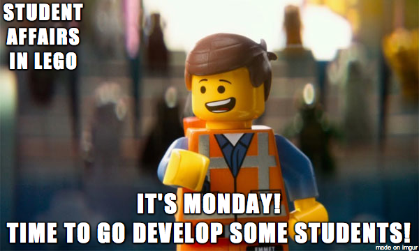 Because we built so much fun together last time, let's build another student affairs meme. (photo credit) (photo credit) (photo credit) (Appropriate photo credit was attempted to be given when possible. Photos without attribution come from LEGO or screen captures from The LEGO Movie. These were created by me and LEGO does not endorse this post.)