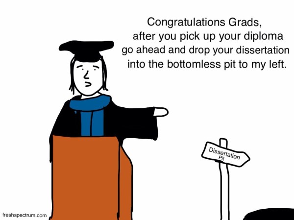 https://www.youtube.com/watch?v=qqrCoyVK80I It's done. Congratulations! That dissertation you've stressed over for months... that you've labored over for years... It's finally complete. You've uploaded it to a database, or submitted it to the library, and there it sits. New knowledge. Waiting for discovery. Put on that fancy new robe and stride across the stage. After you pick... Continue Reading →