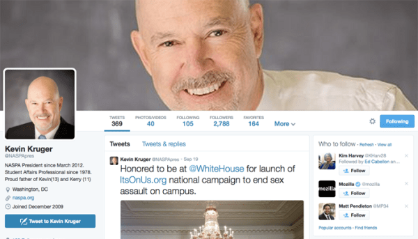 As one of two of the comprehensive student affairs professional associations based in the United States, NASPA is one of the organizations you need to follow. You can also follow Kevin Krueger, the current president of NASPA, who tweets under his own @NASPApres account. Follow him to stay abreast of some of the goings on in Washington, as... Continue Reading →