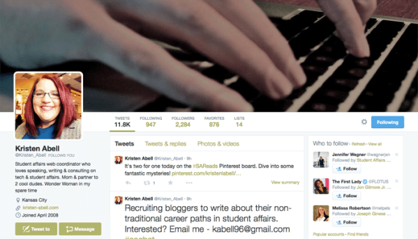 Kristen is a great follow if you want to stay current on tech in higher education and student affairs. Kristen is one of the co-founders of the Student Affairs Women Talk Tech blog, and she maintains her own blog on topics ranging from technology to mental health. Kristen and I serve on the ACPA Task... Continue Reading →