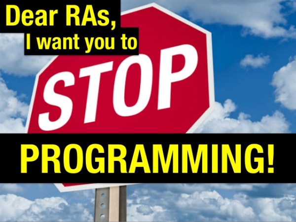 We're all familiar with the premise that food is a necessary component of any educational endeavor in the residence halls. Attract residents with pizza and then ambush them with educational content. Although there is nothing wrong with incentivizing participation in an educational activity, the premises behind this mindset are problematic. This approach assumes that the problem with an educational program... Continue Reading →