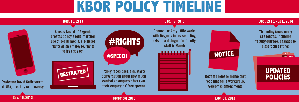If you are interested in either research around policies and/or social media impact to organizations, specifically post-secondary education, then you most likely heard about the Kansas Board of Regents approval to amend their policy manual back in December 2013 to outline “improper use of social media by University of Kansas faculty.” If not, I have an article and infographic of the timeline of events for you: